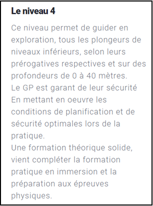Le diplôme de Guide de palanquée est le pré-requis au monitorat fédéral 1er dégré FFESSM.